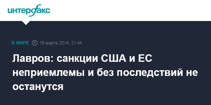 Москва. 18 марта. INTERFAX.RU - Министр иностранных дел РФ Сергей Лавров в телефонном разговоре с госсекретарем США Джоном Керри заявил, что введенные США и Евросоюзом санкции против РФ "абсолютно неприемлемы и без последствий не останутся". Разговор состоялся во вторник по инициативе американской стороны, сообщает МИД РФ.