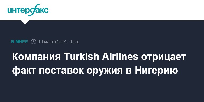 Москва. 19 марта. INTERFAX.RU - Представители турецкого авиаперевозчика Turkish Airlines отвергают обвинения в том, что авиакомпания поставляла вооружения в Нигерию, сообщает в среду агентство Associated Press.