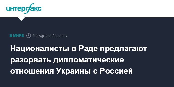 Москва. 19 марта. INTERFAX.RU - В Верховной Раде Украины зарегистрирован проект постановления о разрыве дипломатических отношений с Российской Федерацией.
