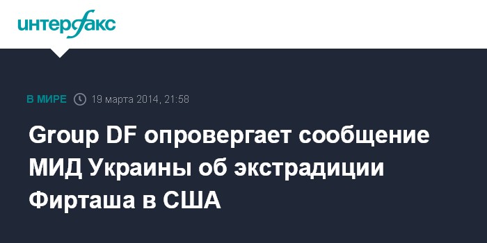 Москва. 19 марта. INTERFAX.RU - Сообщение Министерства иностранных дел Украины о принятии судом первой инстанции в Вене решения об экстрадиции Дмитрия Фирташа в США не соответствует действительности, говорится в распространенном в среду заявлении Group DF, объединяющей активы украинского бизнесмена.