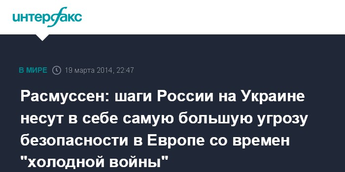 "События на Украине служат ярким напоминанием того, что нельзя принимать безопасность в Европе как само собой разумеющееся. Нам нужно обратить пристальное внимание на то, какие последствия в долгосрочной перспективе будет иметь вмешательство России (в дела Украины) для нашей безопасности", - говорится в тексте выступления Фог Расмуссена.