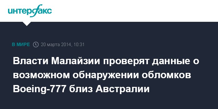 Москва. 20 марта. INTERFAX.RU - Информацию о том, что найденные в море у австралийских берегов объекты могут быть обломками пропавшего малайзийского лайнера, необходимо проверить, заявил в четверг министр транспорта Малайзии Хишамуддин Хусейн.