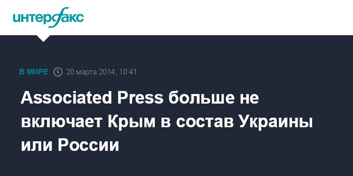 Москва. 20 марта. INTERFAX.RU - Американское информационное агентство Associated Press изменило категорию для новостей из Крыма: теперь в выходных данных он не относится ни к России, ни к Украине.