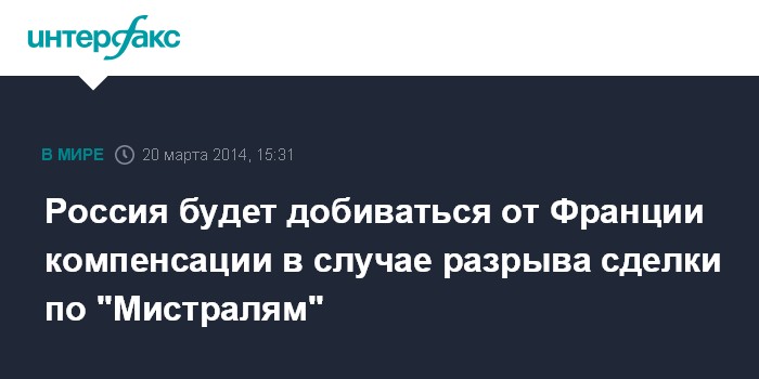 Так он прокомментировал заявление французских официальных лиц о возможном срыве поставок вертолетоносцев "Мистраль" российскому ВМФ в качестве санкции за воссоединение Крыма с РФ.