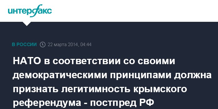 "Референдум в Крыму был абсолютно легитимным. Считаю, что альянс, называя себя клубом демократических государств, должен признать этот факт и уважать демократический выбор крымского народа", - сказал высокопоставленный российский дипломат, выступая в пятницу вечером в дискуссии на тему "НАТО в переходный период".