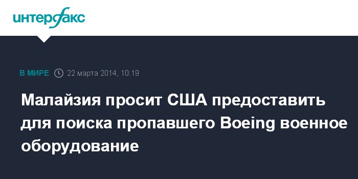 Москва. 22 марта. INTERFAX.RU - Малайзия обратилась к Соединенным Штатам с просьбой предоставить военное оборудование для подводного наблюдения, чтобы помочь в поисках пропавшего авиалайнера Boeing 777, передает BBC. Соответствующий запрос пришел в Пентагон от министра транспорта Малайзии, отмечается в сообщении телерадиокорпорации.