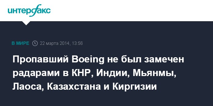 Москва. 22 марта. INTERFAX.RU - В КНР, Индии, Мьянме, Лаосе, Казахстане и Киргизии констатировали, что пропавший в начале марта малазийский пассажирский самолет действительно не был замечен их радарами, сообщает в субботу телерадиокорпорация BBC. В сообщении говорится, что эти страны проинформировали об этом малазийские власти.