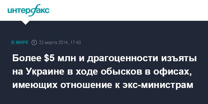 Москва. 22 марта. INTERFAX.RU - Следователи Генеральной прокуратуры Украины провели 32 обыска в офисах и помещениях, имеющих отношение к экс-министру энергетики и угольной промышленности Эдуарду Ставицкому и экс-министру аграрной политики и продовольствия Николаю Присяжнюку. Изъяты миллионы долларов, драгоценности, задержана бухгалтер фирм Э.Ставицкого.