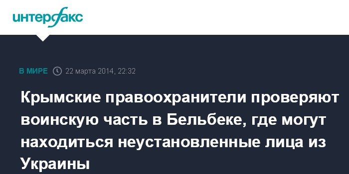 Москва. 22 марта. INTERFAX.RU - Сотрудники правоохранительных органов Крыма осматривают территорию воинской части вооруженных сил Украины, где могут находиться неустановленные лица, прибывшие туда из различных регионов Украины.