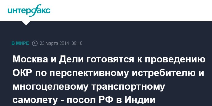Москва. 23 марта. INTERFAX.RU - Россия и Индия ведут консультации по подготовке контрактов на проведение опытно-конструкторских работ (ОКР) по программе совместной разработки перспективного многофункционального истребителя и многоцелевого транспортного самолета.