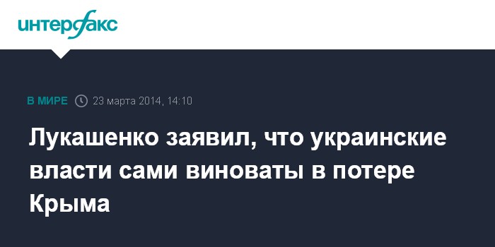 Москва. 23 марта. INTERFAX.RU - Президент Белоруссии Александр Лукашенко считает, что украинские власти допустили множество ошибок, которые привели в результате к потере Крыма. "Украинские власти допустили очень много ошибок и сами подставились", - заявил А. Лукашенко журналистам в воскресенье в Минске.