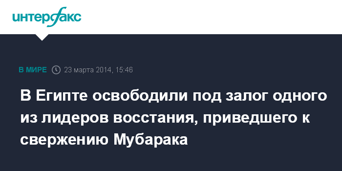 Москва. 23 марта. INTERFAX.RU - Египетский суд освободил в воскресенье под залог известного политика Алаа Абдель Фаттаха, сыгравшего ведущую роль в восстании 2011 года, свергнувшего бывшего президента Египта Хосни Мубарака, сообщает агентство AP.
