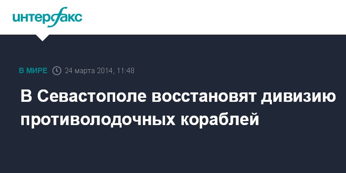 Москва. 24 марта. INTERFAX.RU - Дивизия противолодочных кораблей Черноморского флота (ЧФ) России будет воссоздана в 2015 году в Севастополе, сообщил "Интерфаксу-АВН" в понедельник представитель Главного штаба ВМФ.