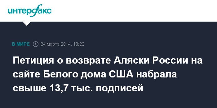 Москва. 24 марта. INTERFAX.RU - Петиция о возвращении Аляски в состав России, открытая на веб-сайте Белого дома в разделе "Мы народ" 21 марта, к утру 24 марта собрала уже 13 757 подписей.