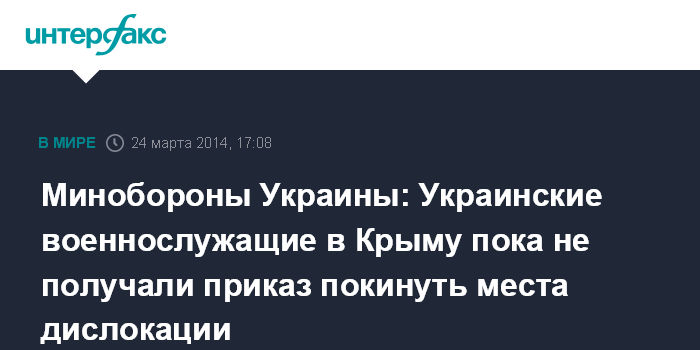 Москва. 24 марта. INTERFAX.RU - Украинские военнослужащие в Крыму еще не получили приказ покинуть места своей дислокации, сообщил пресс-секретарь министерства обороны Украины в Крыму Владислав Селезнев.