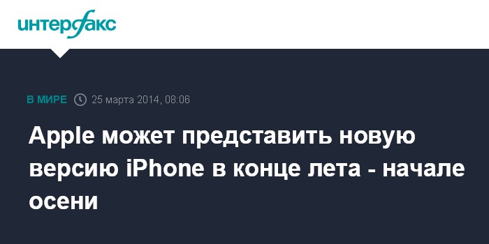 Москва. 25 марта. INTERFAX.RU - Американская Apple Inc. может представить новую, шестую версию смартфона iPhone в конце лета или начале осени, сообщает MarketWatch.