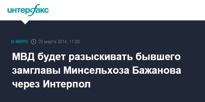 Москва. 25 марта. INTERFAX.RU - МВД по каналам Интерпола объявляет бывшего заместителя министра сельского хозяйства Алексея Бажанова в международный розыск по обвинению в мошенничестве, сообщили "Интерфаксу" в пресс-центре ведомства.