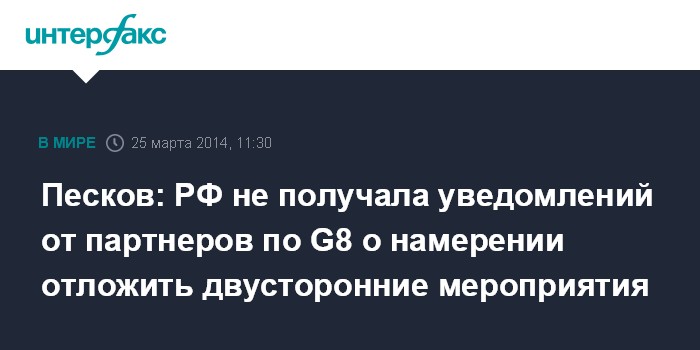 Москва. 25 марта. INTERFAX.RU - Российская сторона не получала уведомлений от коллег по "восьмерке" о возможности отмены или переноса планирующихся двусторонних мероприятий на высшем уровне, сообщил "Интерфаксу" пресс-секретарь президента РФ Дмитрий Песков.