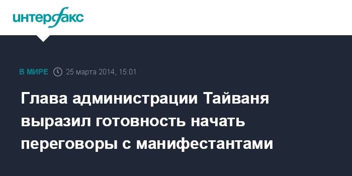 Москва. 25 марта. INTERFAX.RU - Глава тайванской администрации Ма Инцзю готов к переговорам с лидерами бунтующих студентов, которые на прошлой неделе взяли под контроль главное здание местного парламента, говорится в заявлении администрации.