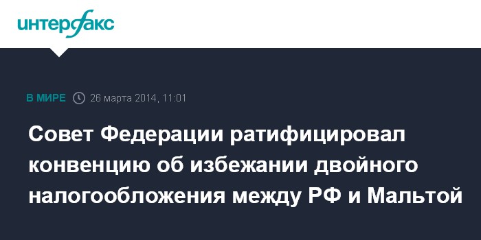 Москва. 26 марта. INTERFAX.RU - Совет Федерации одобрил в среду закон "О ратификации Конвенции между правительством Российской Федерации и правительством Мальты об избежании двойного налогообложения и о предотвращении уклонения от налогообложения в отношении налогов на доходы".