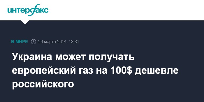 Киев. 26 марта. INTERFAX.RU - Премьер-министр Украины Арсений Яценюк заявляет, что страна может получать из Европы 25 млрд.м.куб газа, который будет на $100 дешевле, чем у российской стороны.