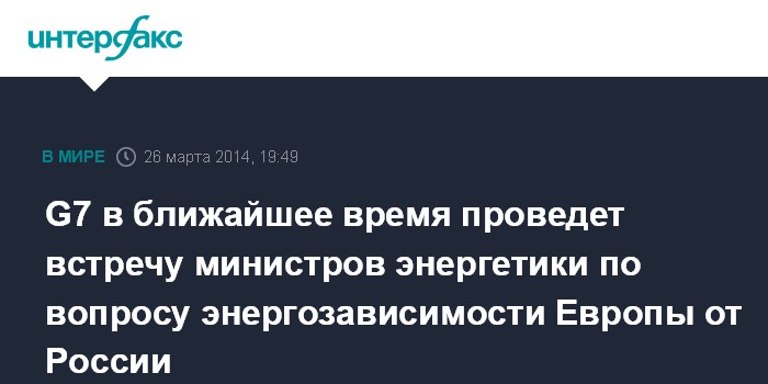 Москва. 26 марта. INTERFAX.RU - Председатель Европейского совета Херман ван Ромпей заявил в среду, что вскоре состоится встреча министров экономики стран G7, которая будет посвящена вопросу зависимости Европы от российских энергоресурсов.
