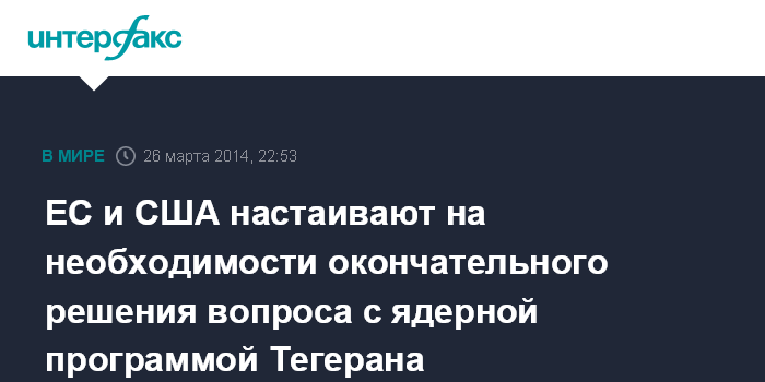 Москва. 26 марта. INTERFAX.RU - Евросоюз и США в ходе саммита в Брюсселе заверили, что прилагают все возможные усилия для достижения успешного исхода в деле урегулирования иранского ядерного вопроса.