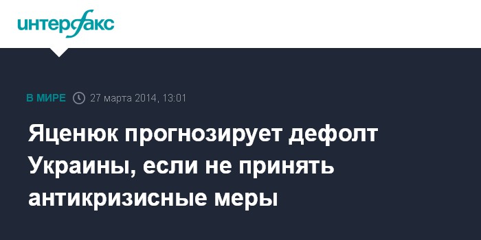Москва. 27 марта. INTERFAX.RU - Премьер-министр Арсений Яценюк заявляет, что если Верховная рада не примет антикризисные меры, предложенные правительством, то Украине грозит дефолт.