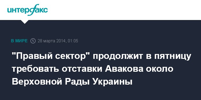 Киев. 28 марта. INTERFAX.RU - "Правый сектор" продолжит в пятницу акцию у стен Верховной Рады Украины акцию с требованием отставки главы МВД Украины Арсена Авакова.