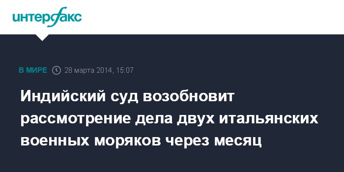 Мадрид. 28 марта. INTERFAX.RU - Верховный суд Индии принял решение временно прекратить рассмотрение дела двух итальянских военных моряков, обвиняемых в убийстве индийских рыбаков, сообщает в пятницу итальянская газета Corierre della sera.