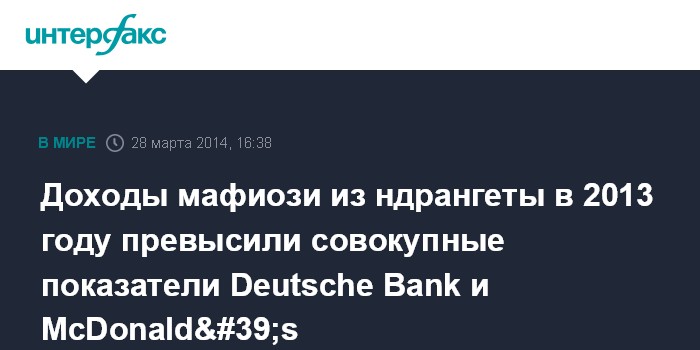 Вашингтон. 28 марта. INTERFAX.RU - Доходы итальянской мафиозной группировки ндрангета за 2013 год составили около $73 млрд, что на $1 млрд превышает аналогичный совокупный показатель американской корпорации McDonald's и немецкого Deutsche Bank, сообщает в пятницу американская газета "Вашингтон пост" со ссылкой на данные итальянского исследовательского института Demoskopika.