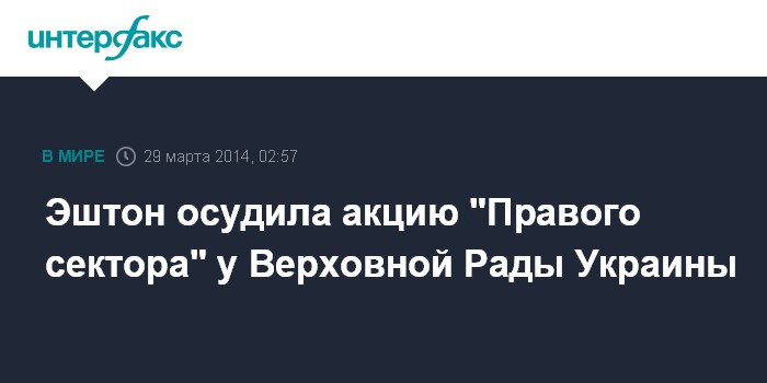 Москва. 29 марта. INTERFAX.RU - Верховный представитель Европейского союза по иностранным делам и политике безопасности Кэтрин Эштон осудила акцию протеста активистов "Правого сектора" Украины у Верховной Рады в Киеве.