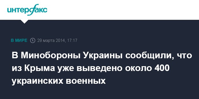 Москва. 29 марта. INTERFAX.RU - Замминистра обороны Украины Леонид Поляков сообщил, что на сегодняшний день из Крыма выведено около 400 украинских военнослужащих. "На сегодняшний день из числа военнослужащих мы вывели около 400 человек", - сообщил он на пресс-конференции в субботу в Киеве.