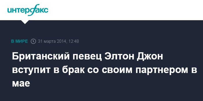 Москва. 31 марта. INTERFAX.RU - Музыкант из Британии сэр Элтон Джон и его гражданский партнер Дэвид Ферниш заявили о намерении заключить официальный брак в мае этого года, сообщил в понедельник американский телеканал NBC.