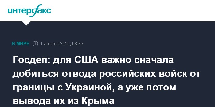 Москва. 1 апреля. INTERFAX.RU - Соединенные Штаты на нынешнем этапе переговоров с Россией настаивают на отводе российских воинских контингентов от границ с Украиной, а не на выводе их из Крыма, заявила официальный представитель Госдепартамента США Мари Харф.