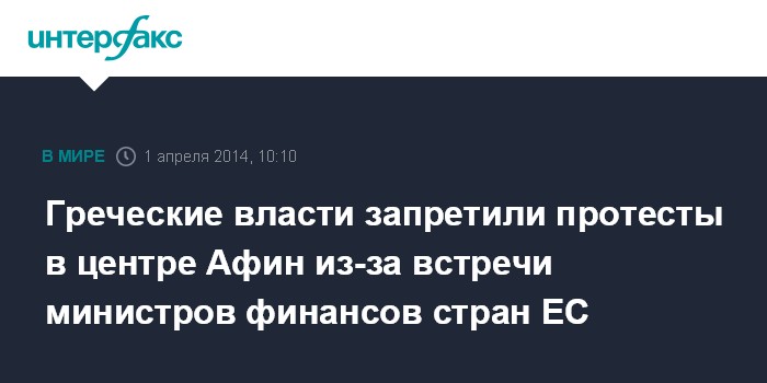 Москва. 1 апреля. INTERFAX.RU - Греческое министерство внутренних дел запретило протесты в центре Афин на время встречи министров финансов стран Евросоюза, передает BBC.