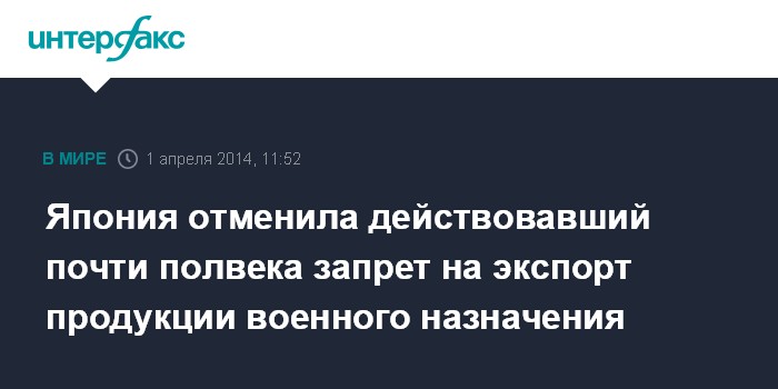 Москва. 1 апреля. INTERFAX.RU - Правительство Японии отменило действовавший десятилетия запрет на экспорт продукции военного назначения.