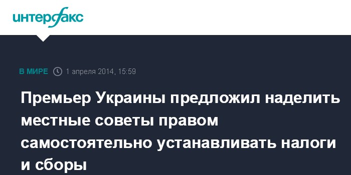 Москва. 1 апреля. INTERFAX.RU - Органы местной власти на Украине должны самостоятельно устанавливать налоги и сборы, часть налога на прибыль предприятий должна оставаться на местах, считает премьер-министр Украины Арсений Яценюк.