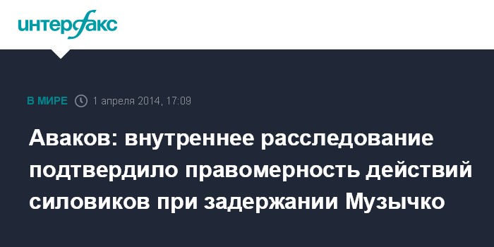 Москва. 1 апреля. INTERFAX.RU - По результатам внутреннего расследования действия правоохранителей во время задержания координатора "Правого сектора" на Западной Украине Александра Музычко признаны правомерными, заявил министр внутренних дел Арсен Аваков.