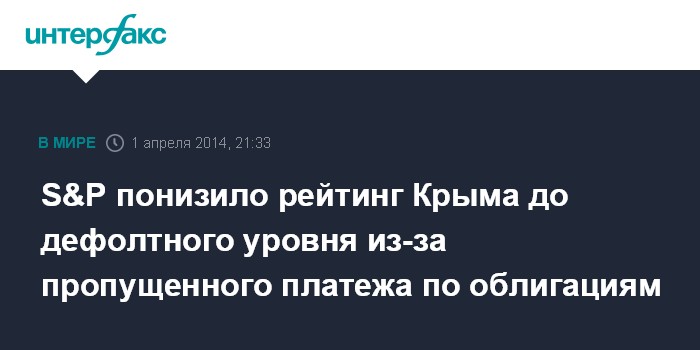 Москва. 1 апреля. INTERFAX.RU - Международное рейтинговое агентство Standard & Poor's (S&P) понизило долгосрочный кредитный рейтинг эмитента Крыма с "CCC" до дефолтного уровня "D" в связи с пропущенным 21 марта купонным платежом на сумму 4,8 млн грн по облигациям, выпущенным на 133 млн гривен.