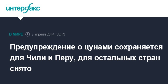 Москва. 2 апреля. INTERFAX.RU - Предупреждение об опасности цунами, вызванного мощным землетрясением магнитудой 8,2 в ночь на среду у чилийского побережья, снято для всех стран и районов кроме Чили и Перу, сообщил Тихоокеанский центр предупреждения цунами.