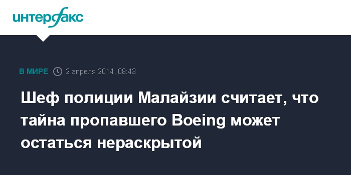 Москва. 2 апреля. INTERFAX.RU - Тайна исчезновения Boeing 777 Malaysia Airlines может остаться нераскрытой, заявил в среду журналистам шеф полиции Малайзии Халид Абу Бакар.