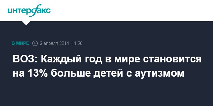 Москва. 2 апреля. INTERFAX.RU - Число детей, у которых диагностируется аутизм, растет каждый год более чем на 10%, свидетельствуют данные Всемирной организации здравоохранения.