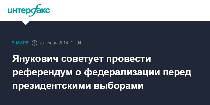 Москва. 2 апреля. INTERFAX.RU - Перед выборами на Украине необходимо провести референдум о федерализации регионов, считает Виктор Янукович.