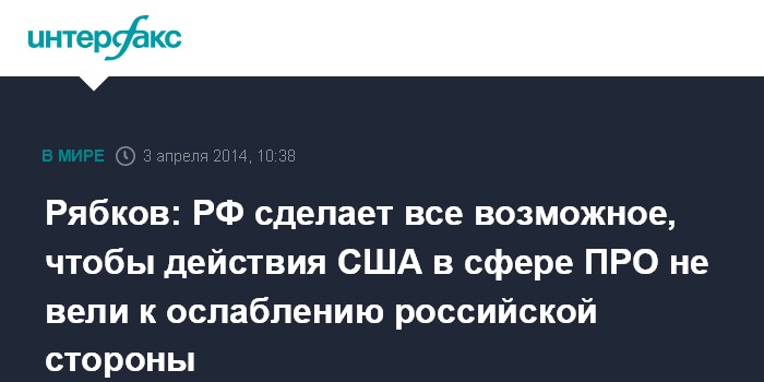 Москва. 3 апреля. INTERFAX.RU - Россия сделает все возможное для того, чтобы американские действия в сфере ПРО не ослабили ее возможности по ядерному сдерживанию, заявил замглавы МИД РФ Сергей Рябков.