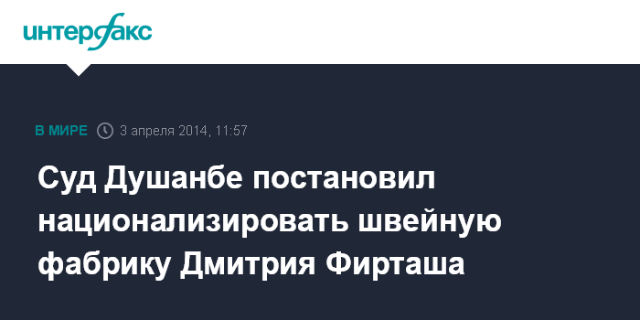 Москва. 3 апреля. INTERFAX.RU - Экономический суд Душанбе признал недействительной сделку по покупке компанией украинского бизнесмена Дмитрия Фирташа 95% акций швейной фабрики "Гулистон" и постановил передать активы предприятия в распоряжение правительства Таджикистана.