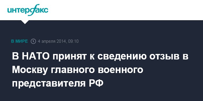 Москва. 4 апреля. INTERFAX.RU - В НАТО приняли к сведению решение руководства министерства обороны РФ отозвать для консультаций главного военного представителя России при Североатлантическом альянсе Валерия Евневича.