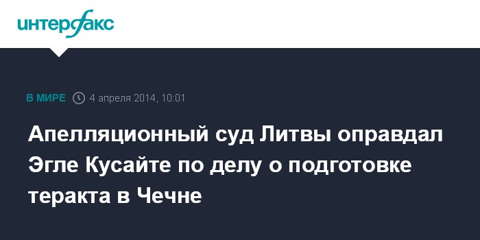 Москва. 4 апреля. INTERFAX.RU - Апелляционный суд Литвы в пятницу оправдал жительницу Клайпеды Эгле Кусайте, которую суд первой инстанции признал виновной в деле о намерениях совершить теракт в Чеченской Республике.