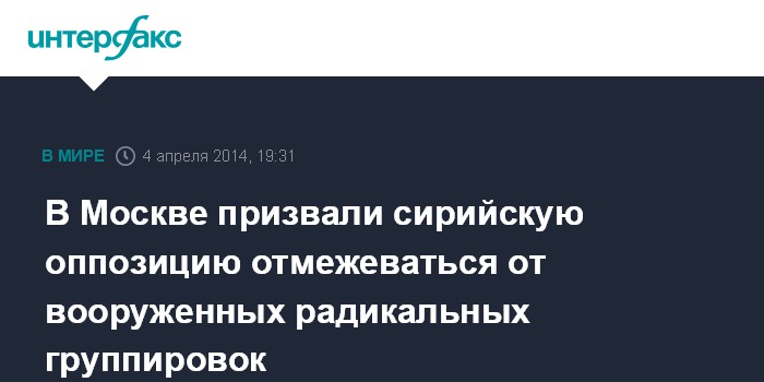 Москва. 4 апреля. INTERFAX.RU - В МИД России призвали оппозиционных сирийских политиков не быть прикрытием для экстремистов и их планов по разрушению Сирии и превращению ее в плацдарм "всемирного джихада".