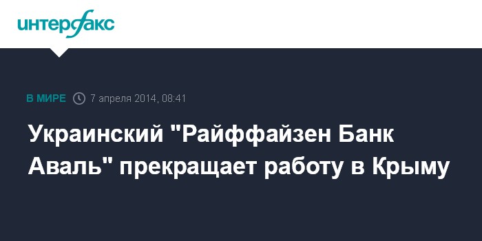 Москва. 7 апреля. INTERFAX.RU - Украинский "Райффайзен Банк Аваль" объявил, что с 15 апреля прекращает работу в Крыму в связи с "отсутствием юридических оснований для дальнейшего функционирования и предоставления банковских услуг" на территории республики, сообщается на сайте банка.